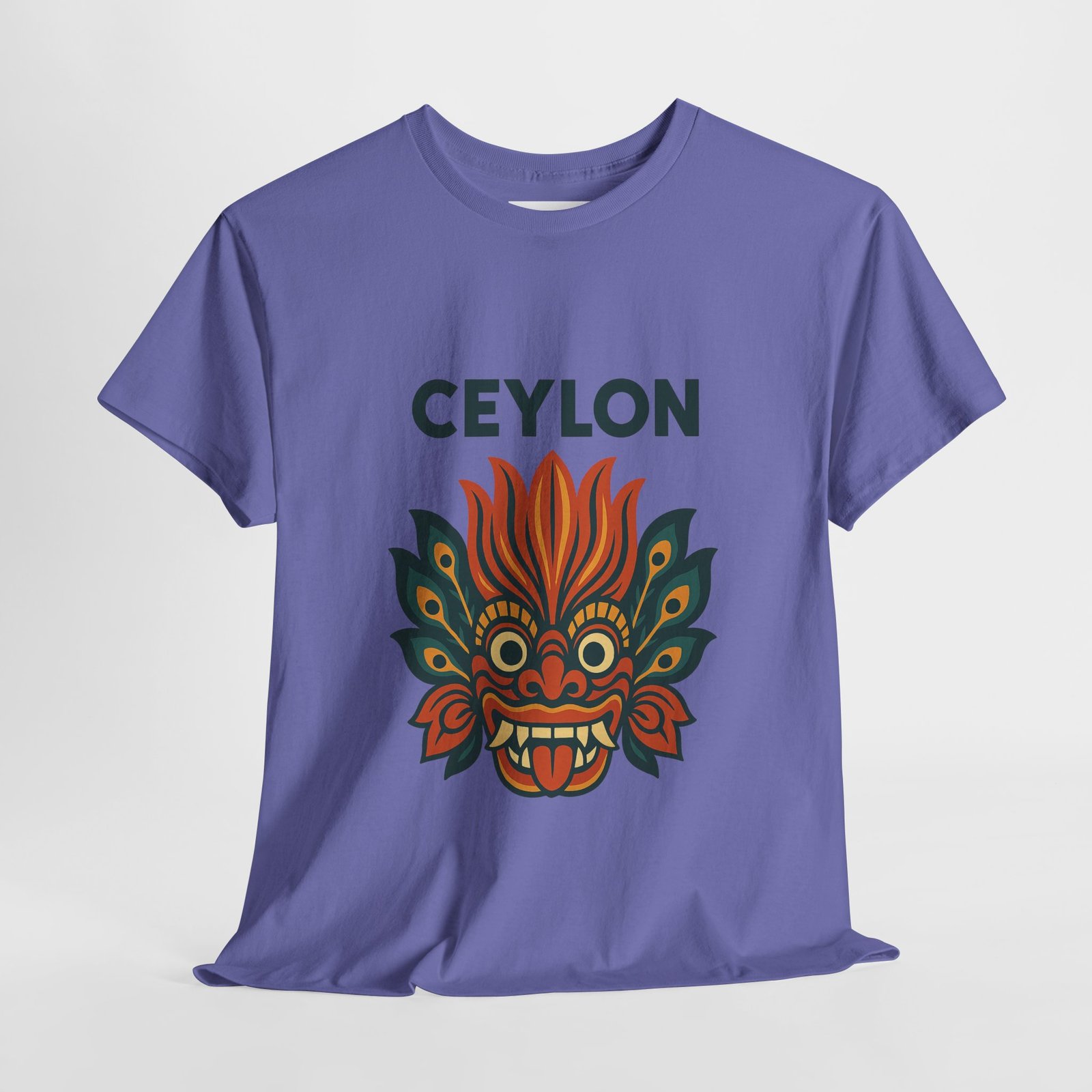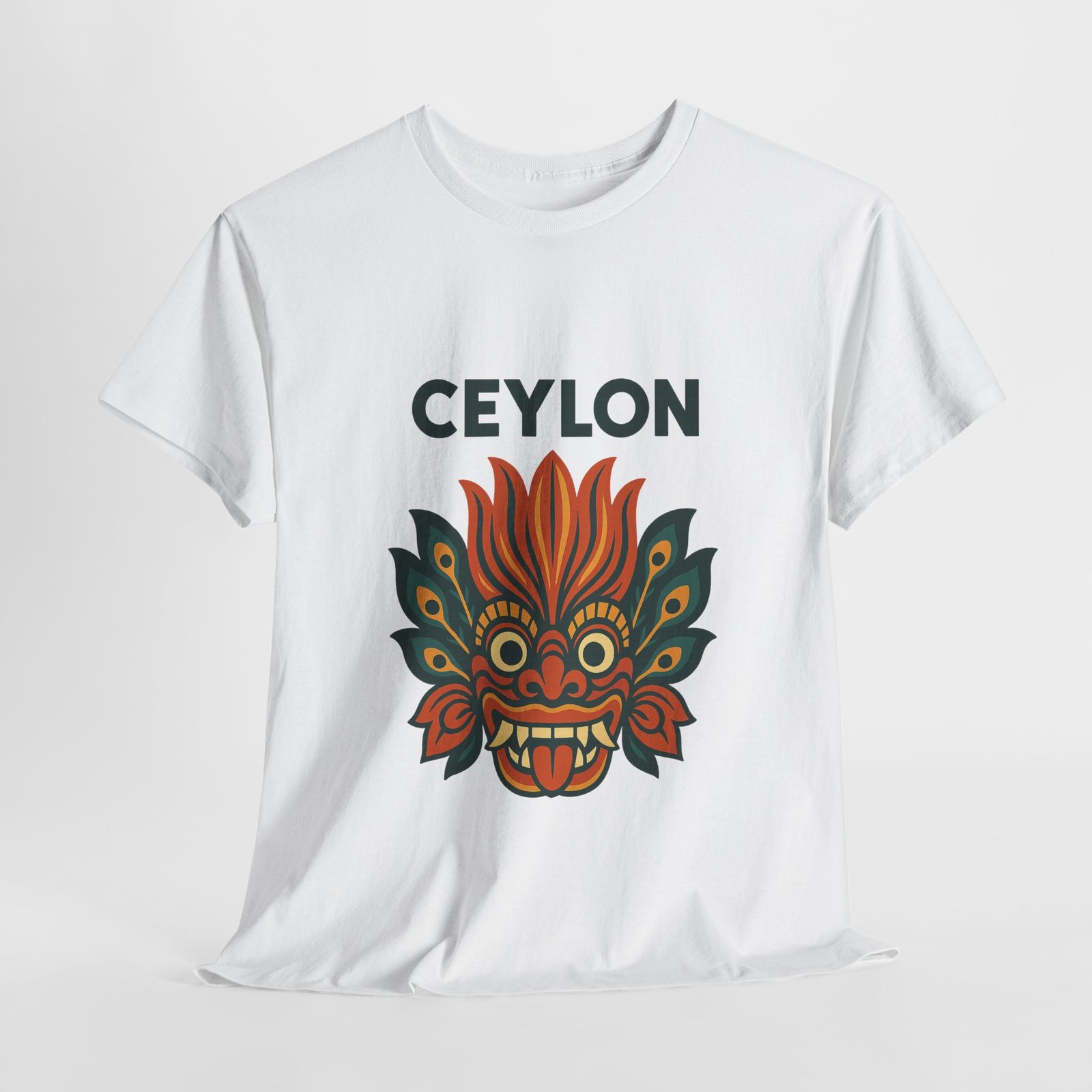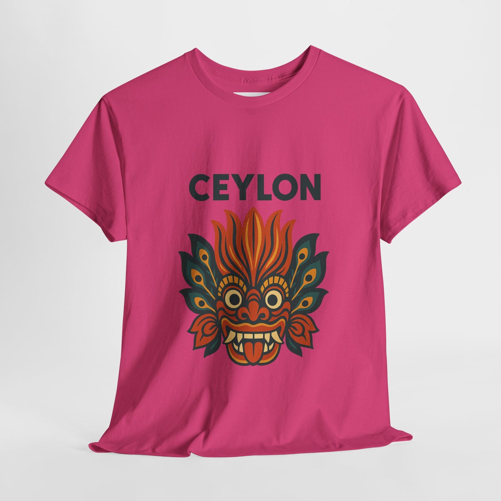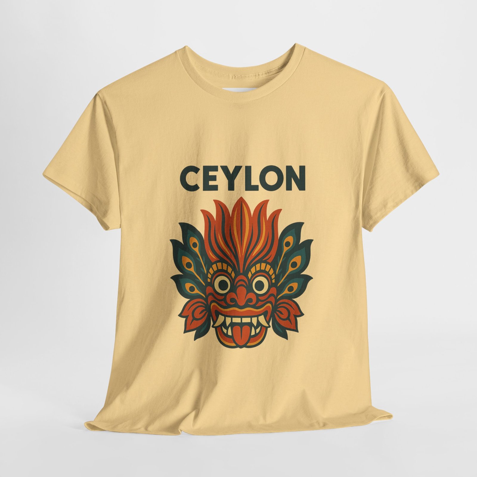 Statement print – Ultra-vivid DTG design inspired by traditional Sri Lankan devil-dance masks. Crack- and fade-resistant.