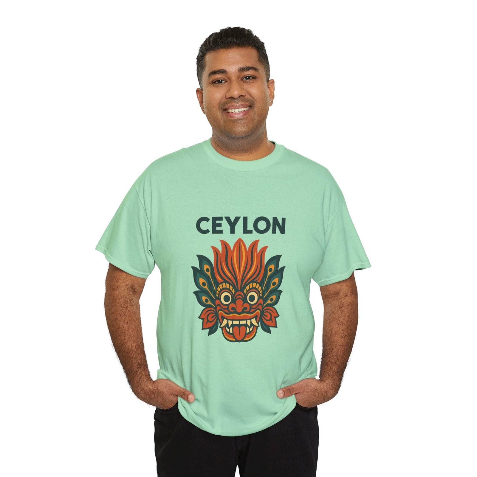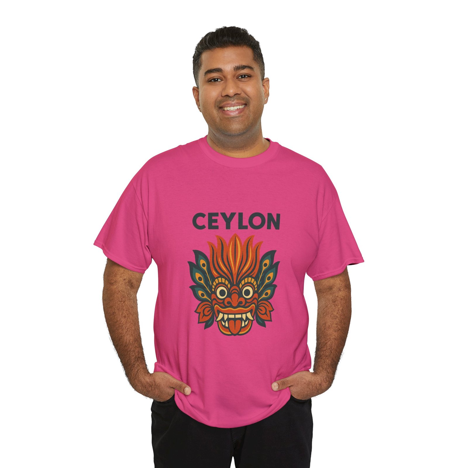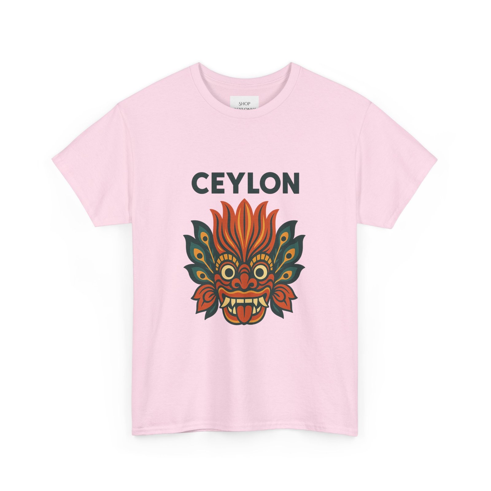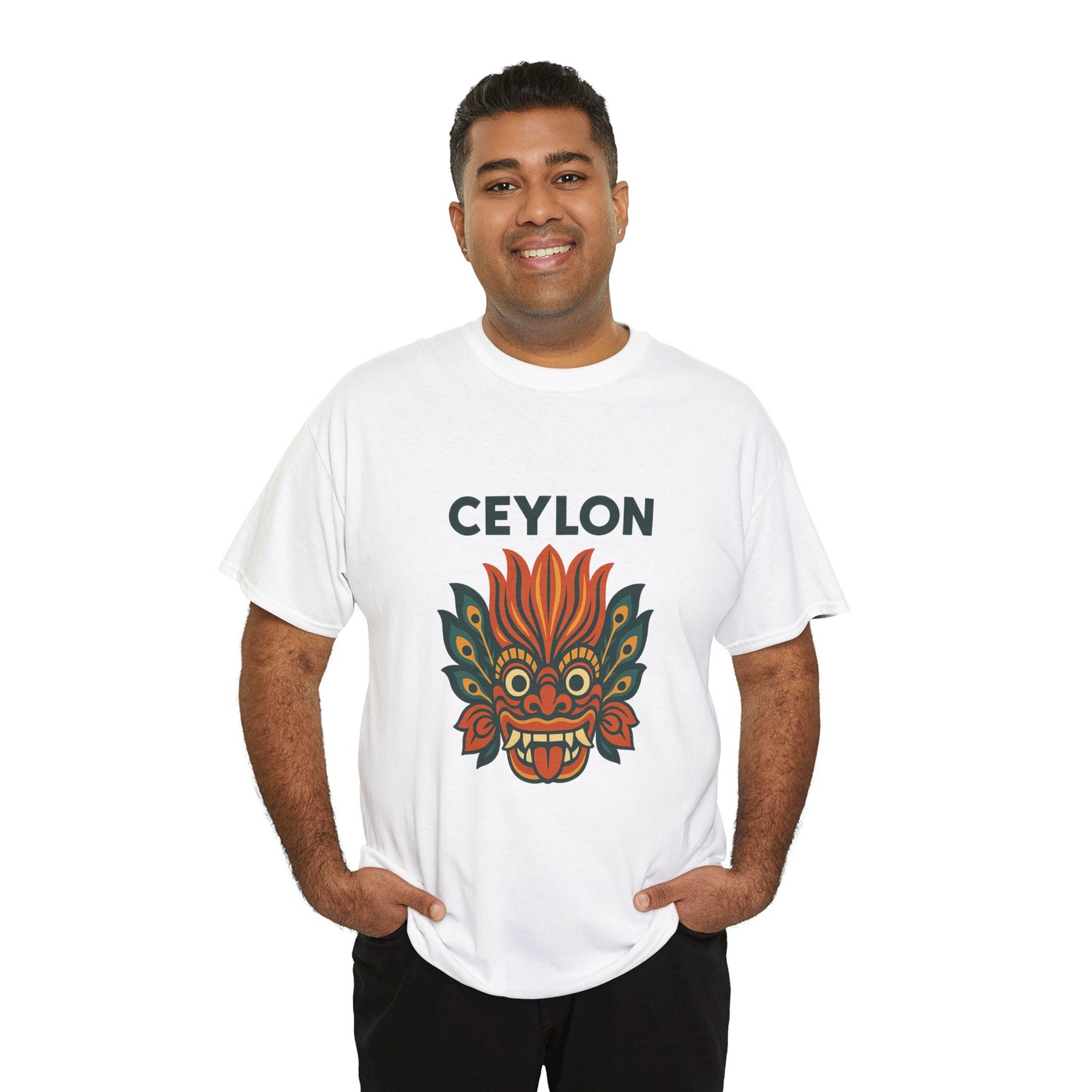Statement print – Ultra-vivid DTG design inspired by traditional Sri Lankan devil-dance masks. Crack- and fade-resistant.